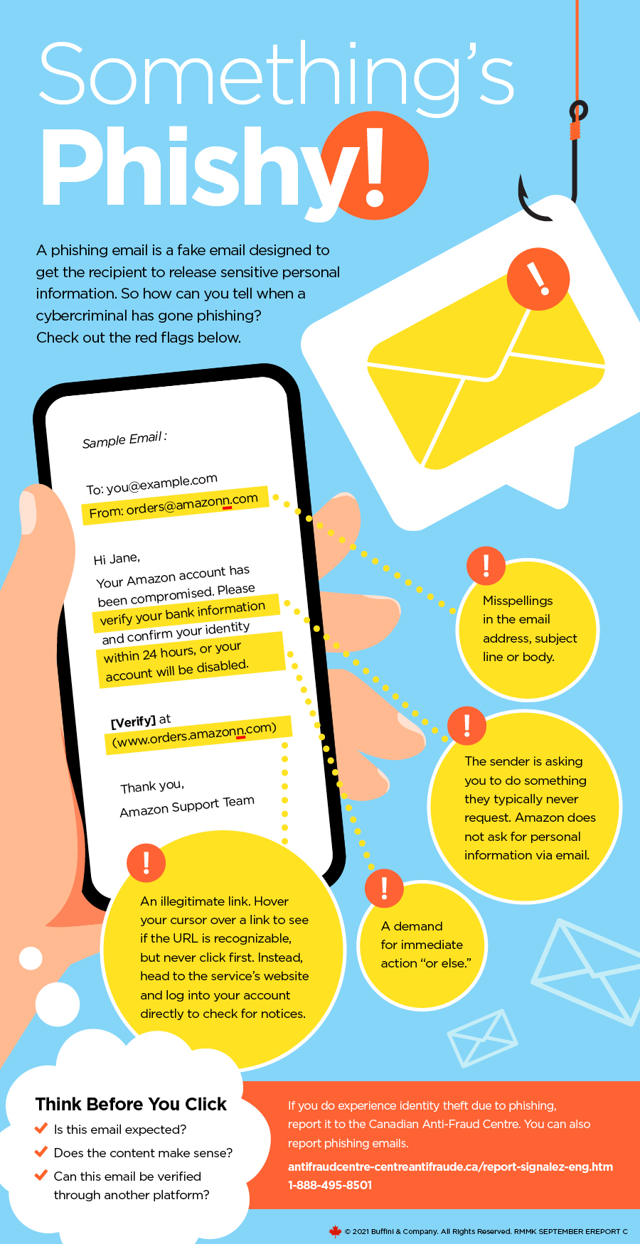 Do you know how to tell if cybercriminals have gone “phishing” for your personal information? Learn to spot the red flags of a suspicious email so the identity thieves never get their big catch! Below are some tips for identifying fake emails so you can click with confidence and keep your personal information protected. Remember these best practices whenever you run through your inbox!